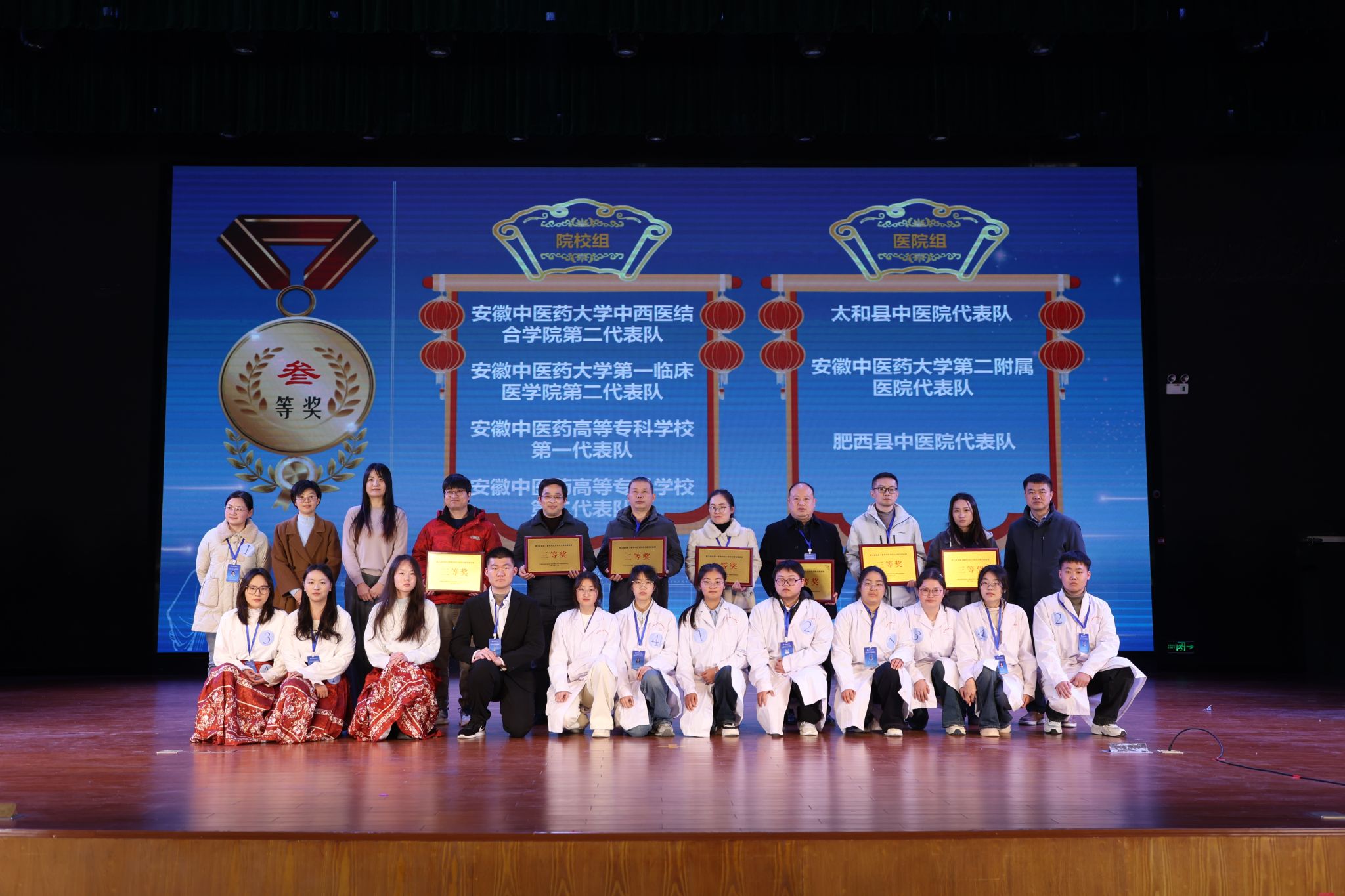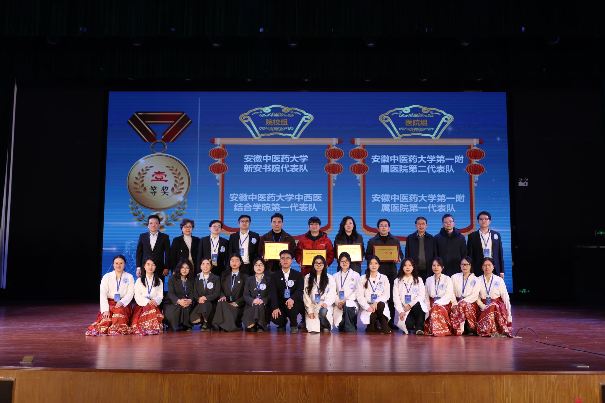 本次竞赛分为院校组和医院组,设置理论考试和现场赛两个环节,全面考察选手的经典积累、理解深度与实践转化能力。吸引了全省17支高校及医院队伍近百名选手参赛。经过多轮紧张激烈的角逐,学校新安书院代表队、中西医结合学院第一代表队以及第一附属医院第一、第二代表队分别获得院校组和医院组一等奖并成功晋级华东赛区区域赛。