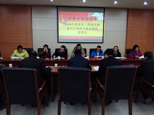 12月28日上午,学校召开了2016年质量工程项目和振兴计划部分项目检查与验收工作评审会。省教育厅高教处、合肥工业大学、安徽大学、安徽医科大学、安徽建筑大学、安徽农业大学、合肥学院和学校部分教学督导和教授等20多位专家对127个质量工程和振兴计划项目以及181个教研项目进行检查与验收。副校长彭代银、教务处和高教所负责人参加了会议。
