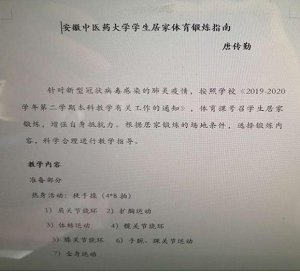 为贯彻落实省教育厅及学校关于做好新冠肺炎疫情防控工作部署,体育部认真执行学校《关于做好2019-2020学年第二学期本科教学有关工作的通知》的文件要求,通过体育网课教学资源,号召大学生利用假期居家健身练习,增强自身抵抗力,做好健康的第一防护人。