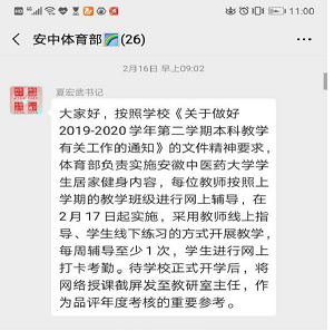 疫情就是命令,防控就是责任。体育部提前布置,精心组织谋划,制定《taptap app下载学生居家健身计划》,2月17日,各体育俱乐部老师们充分利用微信群、PPT、QQ、iMovie、学习通等软件,制定计划、视频教学、交流解答等方式来进行实施,对学生进行网上健康知识和健康方法指导互动。坚定信心,共待春来!虽然疫情暂时阻挡了师生们的回校脚步,但“停课不停学”让我们继续向前,一定能够打赢这场疫情防控的战争。