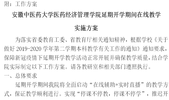 鉴于新型冠状病毒感染的肺炎疫情防控形势严峻,根据学校的统一部署,在保障学院广大师生身体健康和生命安全基础上,不折不扣执行学校相关通知要求,医药经济管理学院第一时间建立线上教学工作领导小组,发布线上教学通知和详细实施方案。学院教学办高度重视在线教学工作,将在线教学辅导材料分发全部课程教师,并组织辅导员通知各班级成立在线教学课程群,所有教师与授课班级进行对接,在线教学基础工作有序开展。