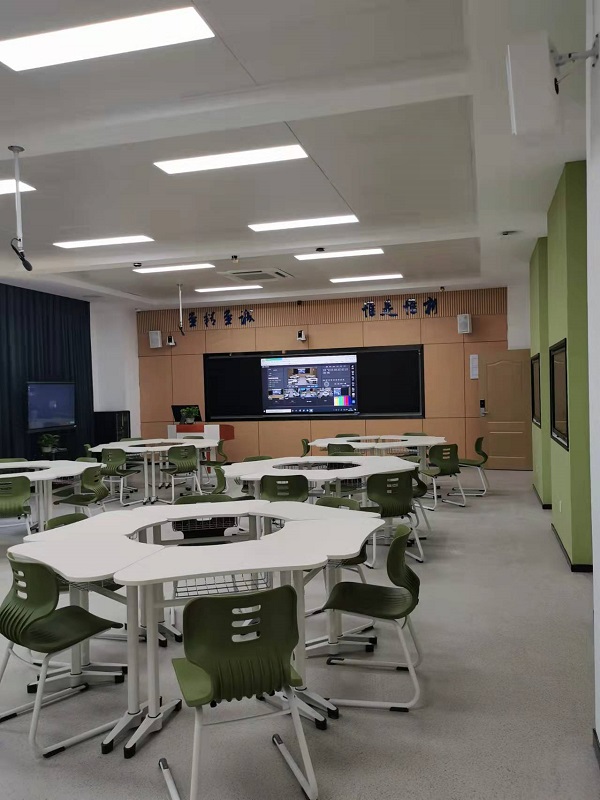 智慧教学区域配有交互式触控大屏装,多功能“智慧黑板”、全4K高清录播设备,无感扩声系统,可活动桌椅和触控式分屏。授课主机安装了智慧教学平台。教室可有效支撑线上线下混合式教学、翻转课堂,PBL教学、跨学科融合教学、案例教学等新型教学形式的开展,让教学从教室延伸到课外,实现在线学习、面对面教学的有机结合。智慧直播互动教室(二期)的建成,为服务现代化教学提供了有力支撑,为我校从传统多媒体教室教学向新型智慧教学空间逐步转型走出了坚实的一步。