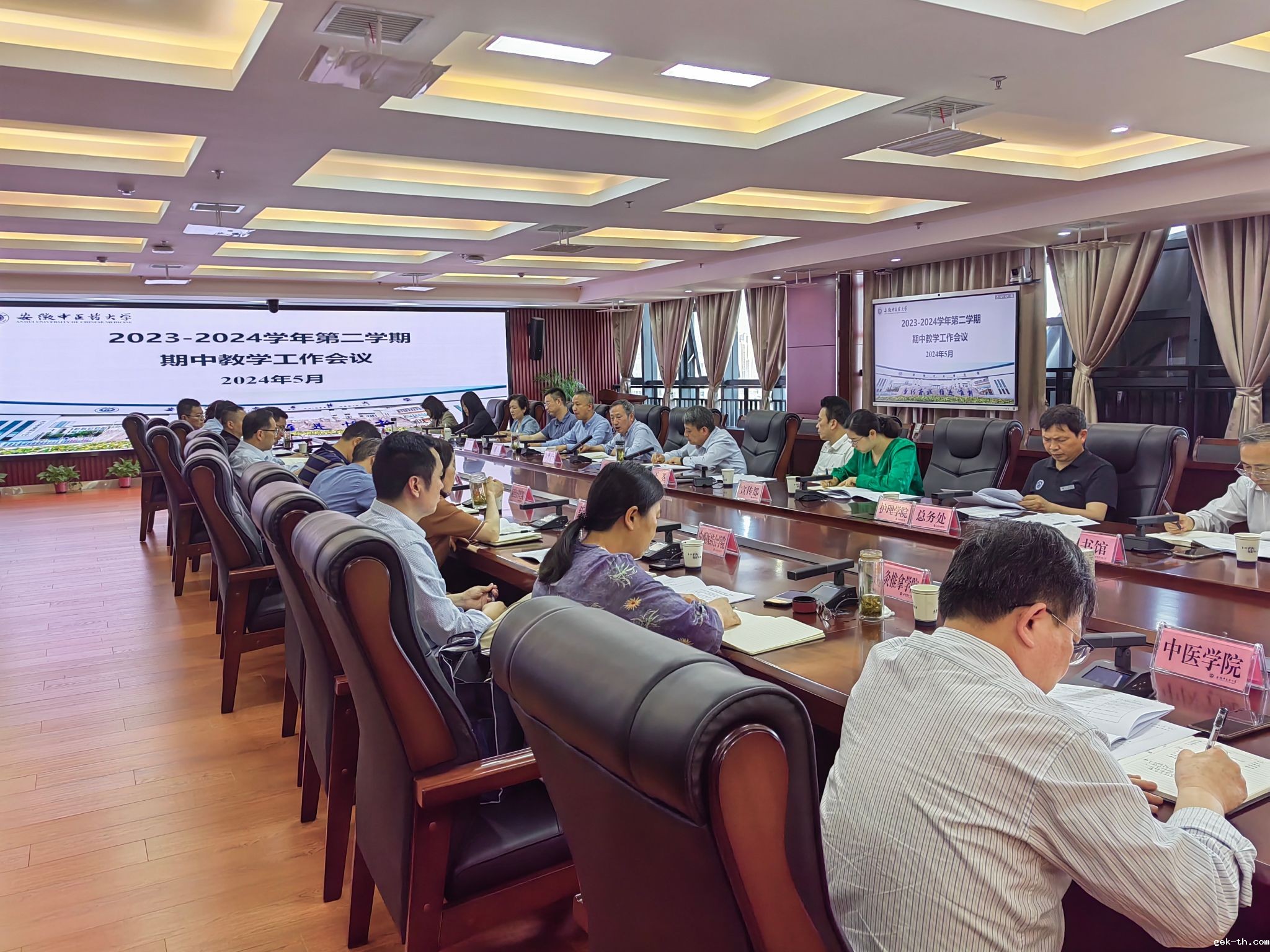 为总结本学期教学工作中的问题,推进学校本学期教学重点工作,5月14日下午,学校召开本学期期中教学工作会议,学校党委副书记、校长许钒,教学督导,宣传部、教务处、学生处、总务处、团委、图书馆、教育教学质量评价中心等部门负责人,各学院院长,三所临床医学院分管教学副院长,教务处、教育教学质量评价中心相关人员出席,会议由许钒校长主持。