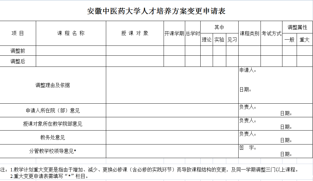 (三)教学单位的人才培养方案需要较大范围调整时(如培养目标、培养规格、学制的调整;课程设置、学时分配、课程顺序的全面调整),由教学单位提出报告并填写《taptap app下载人才培养方案变更申请表》,经教务处审查,分管教学校领导批准后方可进行。